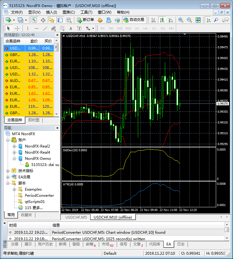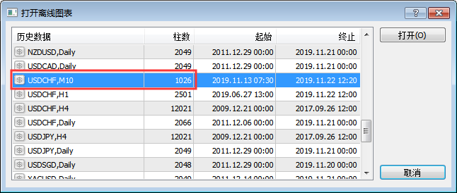 可以看到USDCHF,M10,也就是美瑞的10分钟图数据已经生成,我们双击打开